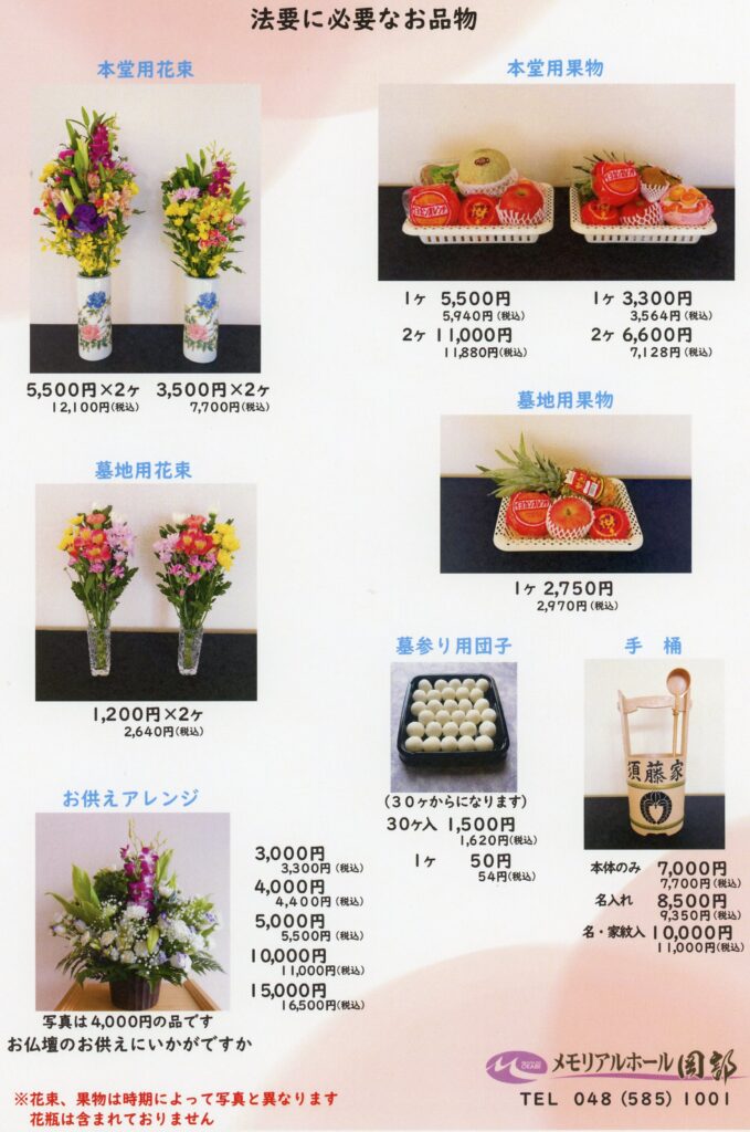 弊社ではご法事に必要な花束、果物、墓参り団子、参列者への返礼品など